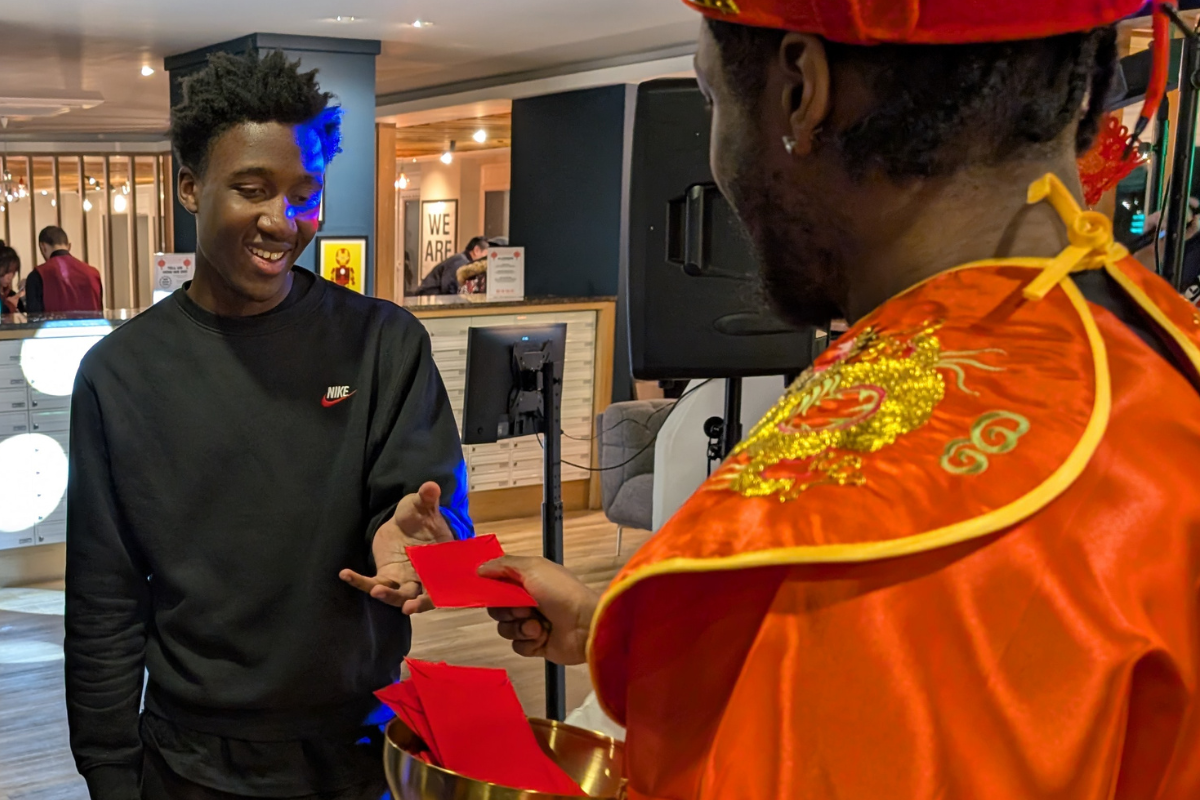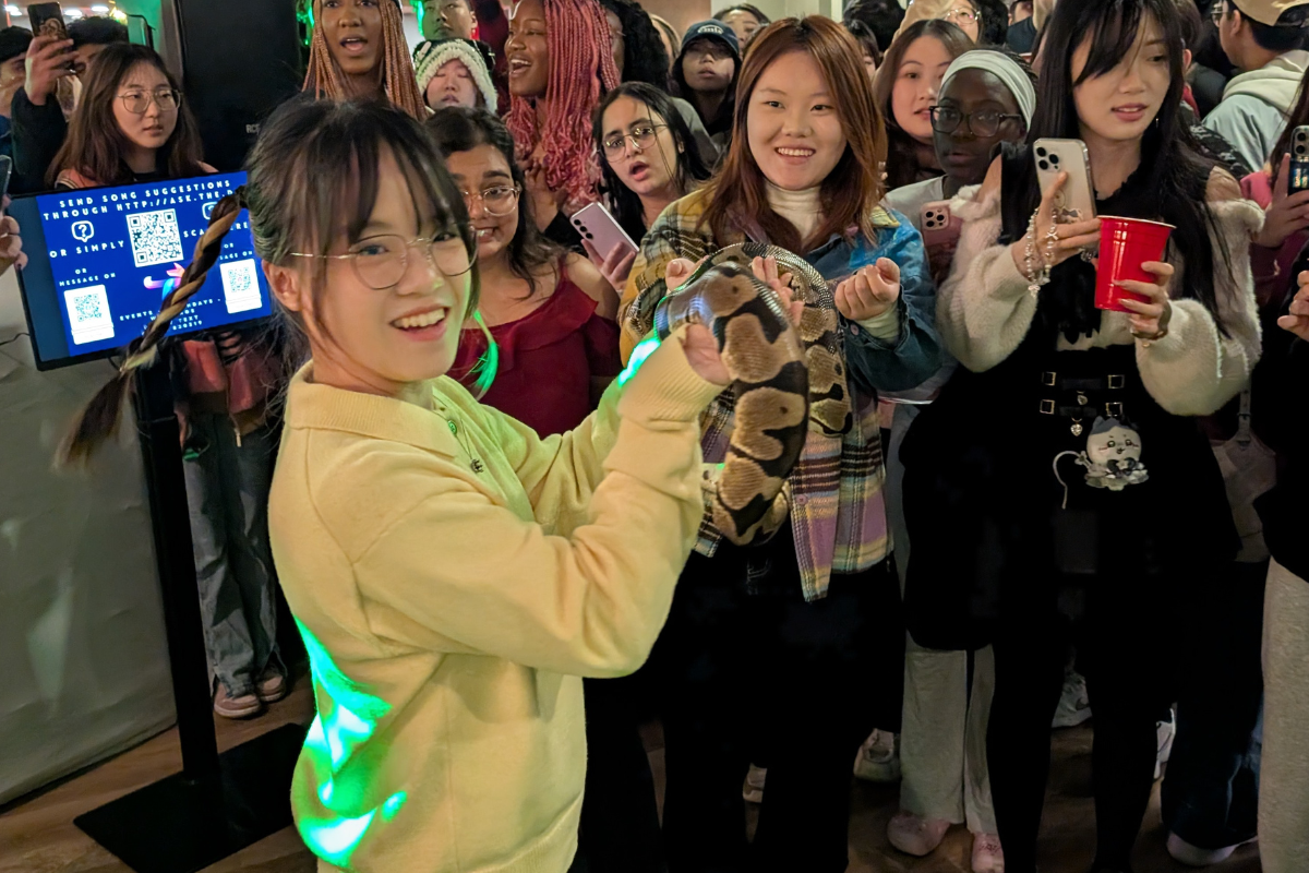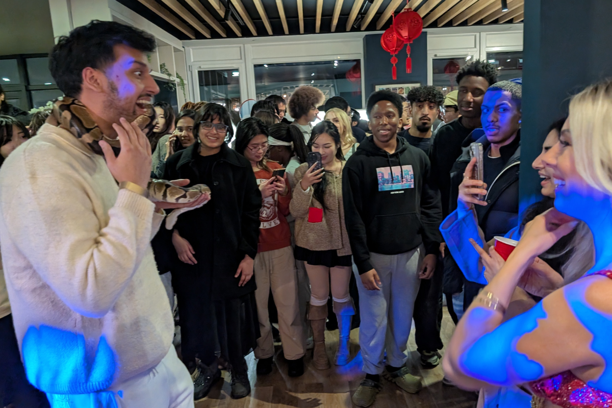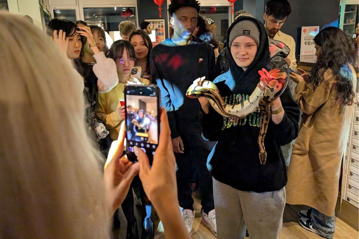 Surprise and wonder as this student carries a snake on their neck during the Lunar New Year celebration