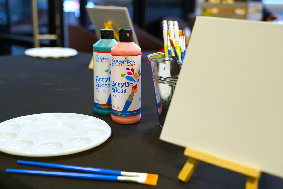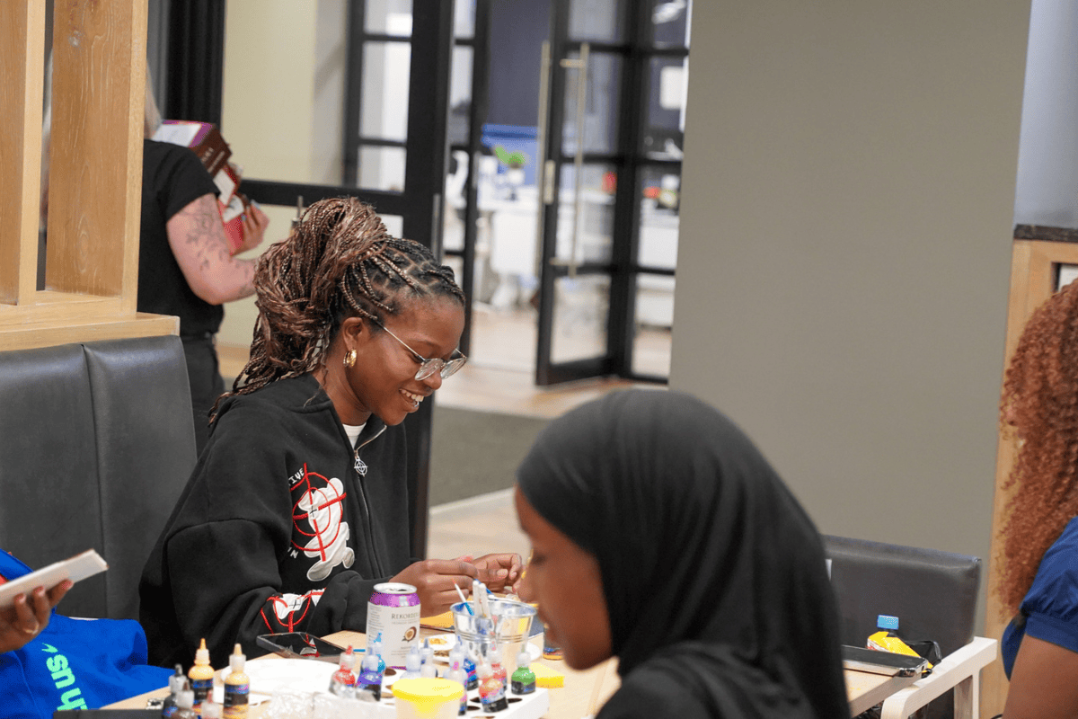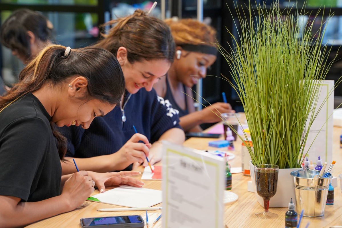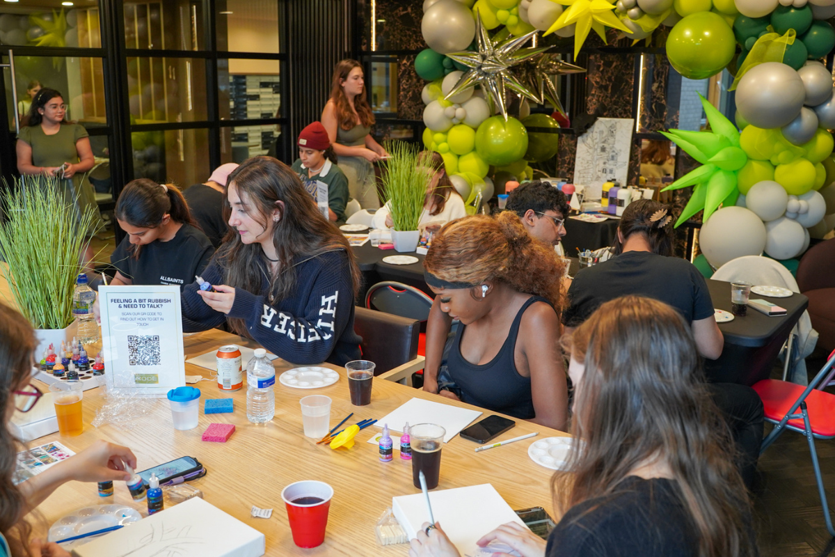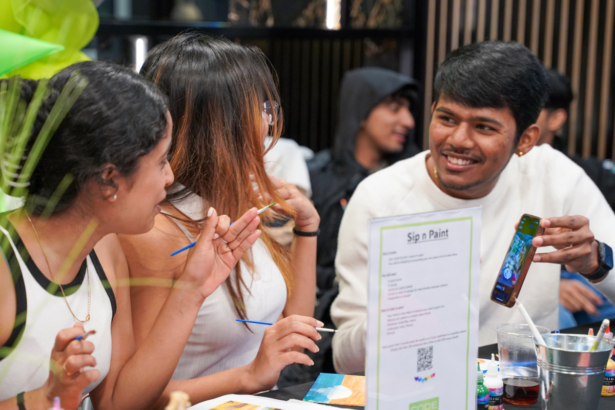 Students enjoying catching up and free drinks at the Sip and Paint event 2024