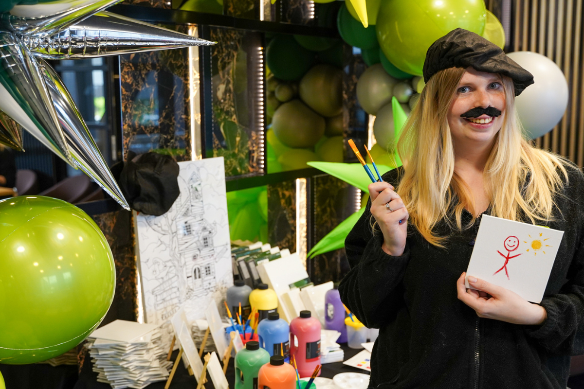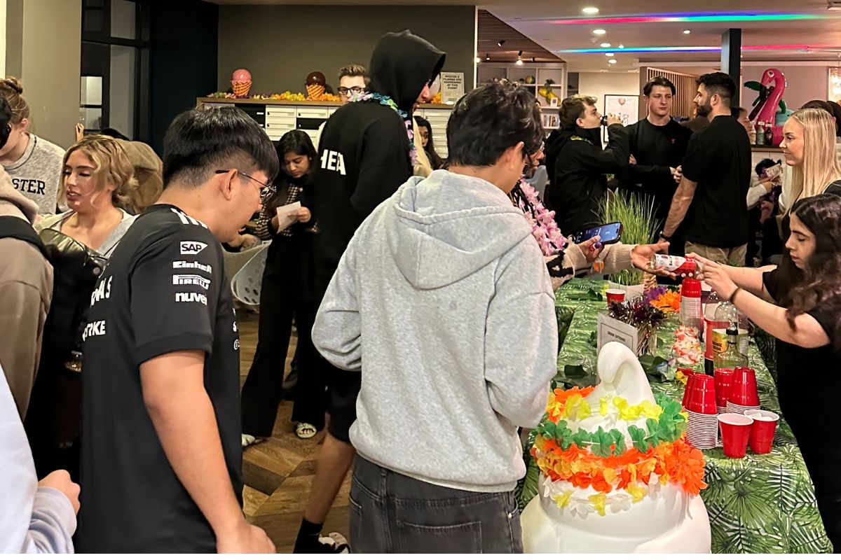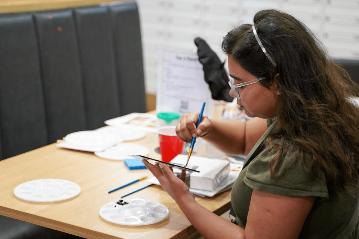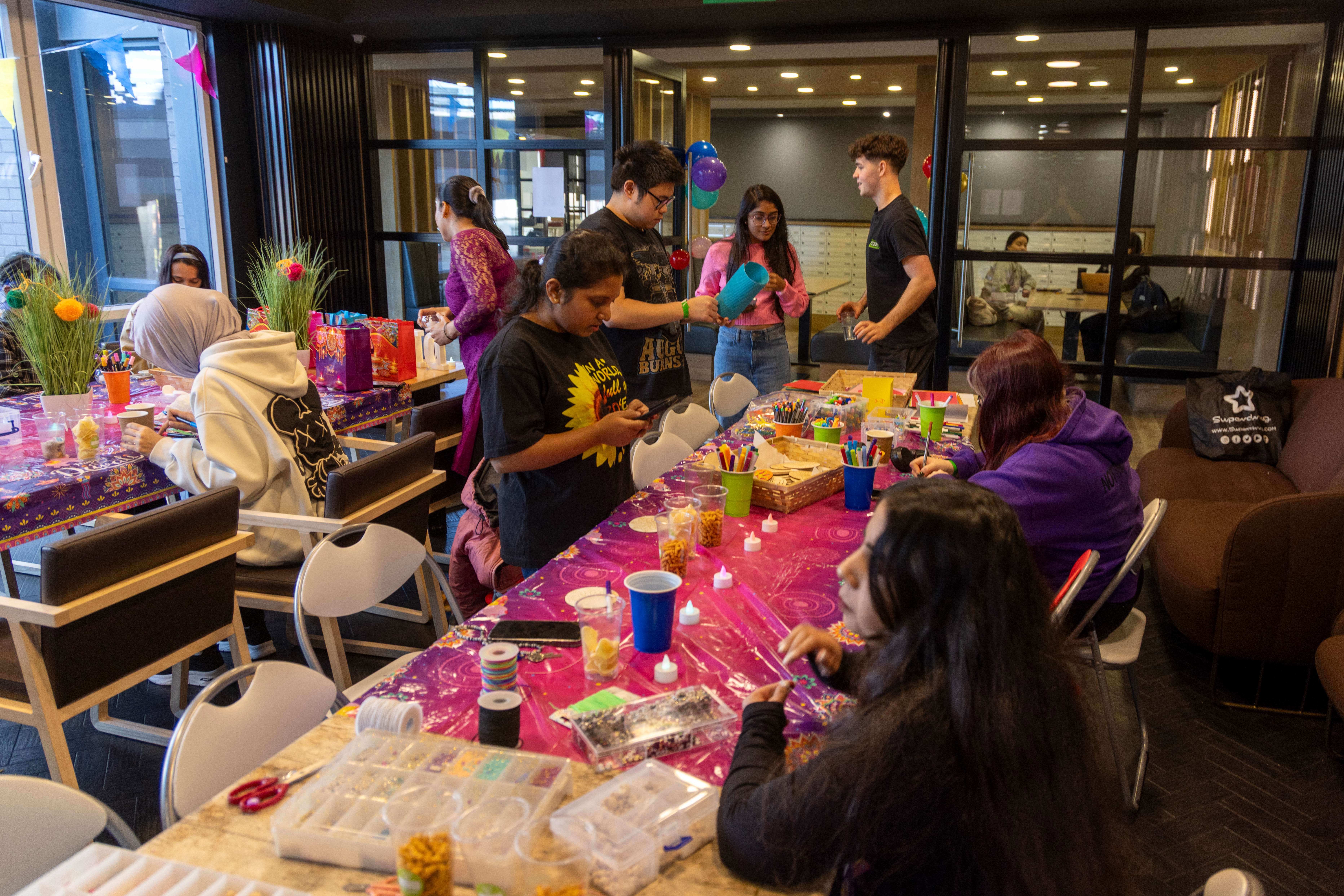 Students enjoying catching up and free drinks at the Sip and Paint event 2024