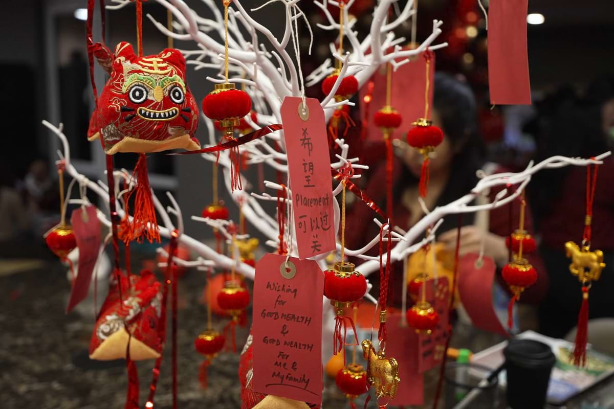 A wish tree is symbolic tree where people hang their wishes or prayers for the upcoming year, usually written on red paper or tags.